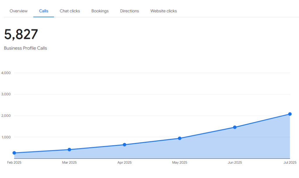 Calls are one of the strongest signals of customer intent. In February, only 268 people called directly through the business listing. By July, this number had climbed to 2,079 — a more than sixfold increase. The biggest jumps occurred in months four through six, as new locally relevant content helped the shop appear in more Dallas-area searches.