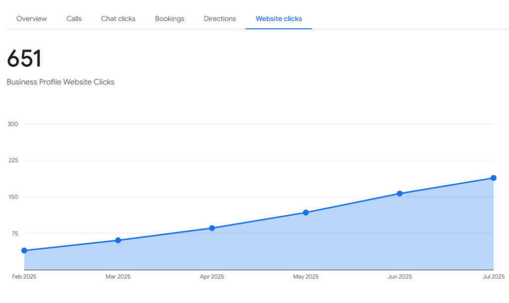 Website clicks represent customers who want to learn more before booking. Growth here was steadier but still dramatic. By July, clicks had nearly quadrupled compared to February. These increases came from adding new service-focused landing pages, optimizing for terms like “fade haircut Dallas,” and regularly refreshing the content with trending barber-related topics.