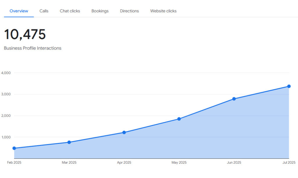 Overall interactions combine calls, clicks, and other profile actions. This category showed the strongest and most consistent growth. From 484 in February to 3,371 in July, the barber shop achieved almost a 600 percent increase. The largest spikes occurred in months three through five, when more content and local optimizations were added.